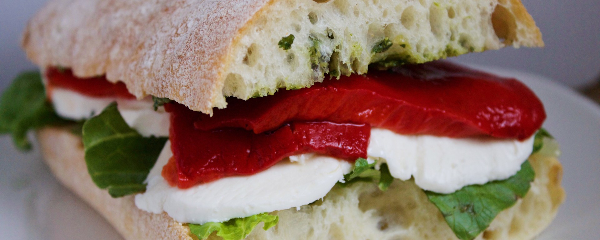 “Caprese” usually means a salad of fresh mozzarella, tomatoes and basil, and it originated in Italy (actually, the colors of the salad resemble the colors on the Italian flag). There are ways you can alter this sandwich to your liking; that’s what I did by adding the roasted peppers. If you’d like, throw on a piece of grilled chicken, or fry up some eggplant in Italian-style bread crumbs and add it (that’s my mom’s favorite way to do it). The bottom line is, cooking is all about creativity. There’s always room for personal taste in a dish. If there’s something you love to add to your Caprese sandwich, let me know (I’d love you give it a try!).