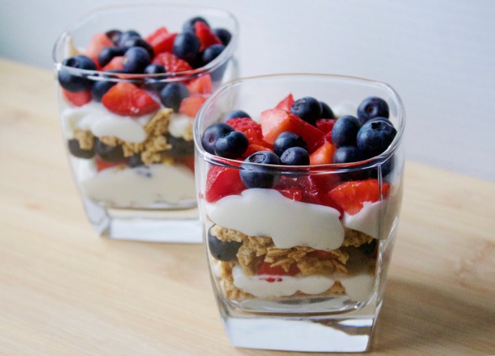 When I want to indulge, I might make some pancakes. But when I want something quick and healthy (and full of fruit), I’ll whip up one of these tasty yogurt parfaits. I always use Greek yogurt because that’s what I’m used to, and it’s better for you. These parfaits are super easy to make, and you can use whatever type of fruit you’d like. I prefer the strawberry/blueberry combo, but strawberry/kiwi is also tasty. Mix it up however you want! If you don’t you’re your granola getting softened by the yogurt, you can make a few in advance and eat them throughout the week.