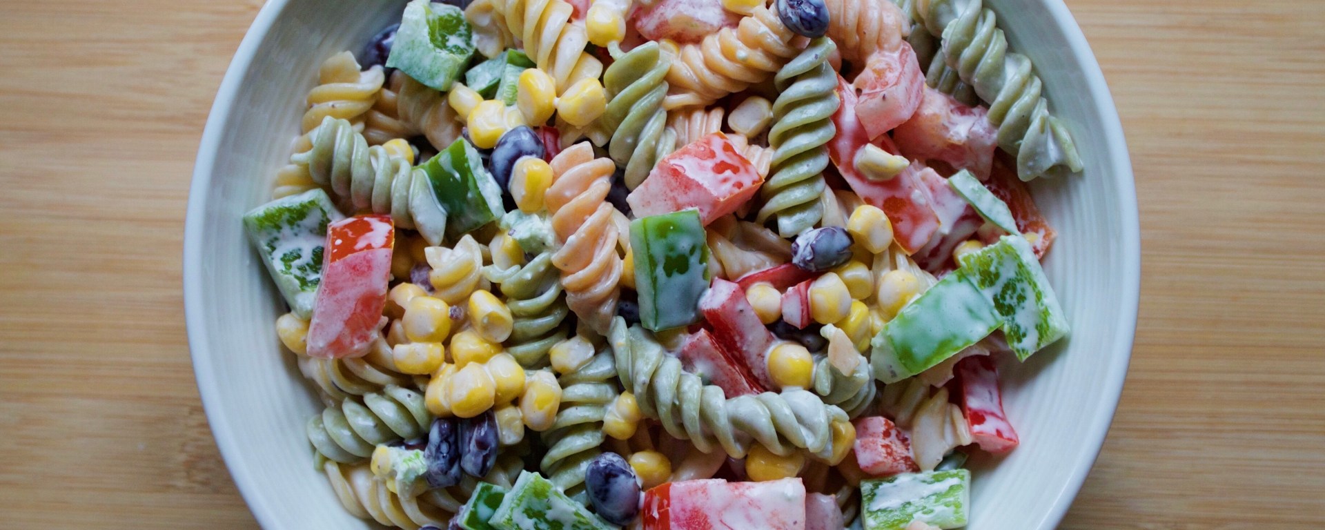 I feel like side salads are a staple at backyard parties. But sometimes cole slaw gets boring, and standard deli macaroni salad always tastes a little sour to me. As someone who loves spice, my first inclination is always to make a spicy salad—one that would add a kick to the backyard menu. This Southwest salad is tossed in a jalapeño dressing, which adds the heat. (Tip: Remove the seeds and white membrane from inside the jalapeño for less spice.) It’s best served cold and is perfect for any summertime dinner. I used veggie-infused pasta, but you can easily swap that for white or whole wheat pasta.