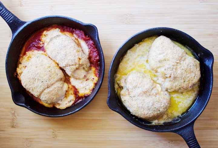 A funny story about the two sauces: I thought a white wine and garlic sauce would taste better, but my sister thought a red sauce would taste better. Obviously I had to make both to figure it out. When they were done cooking, my dad and I sampled each and thought they were both so tasty in their own way. I decided to include both on the blog! The white wine sauce is super easy, and for the red sauce, you can either use a jarred option or try my easy homemade tomato sauce recipe.