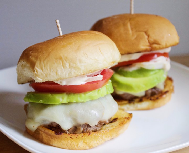 Add ground beef to a large bowl. Add a dash of salt, black pepper, garlic powder, and cayenne pepper to beef; combine. Form into eight slider patties. Add a bit of olive oil to a pan and cook sliders on medium, about 4 minutes on each side or until they’re cooked to your liking. Meanwhile, combine all ingredients for mayo and set aside. Add cheese to patties and melt. Top bun with patty, avocado, tomato, onion, and chipotle mayo and serve.